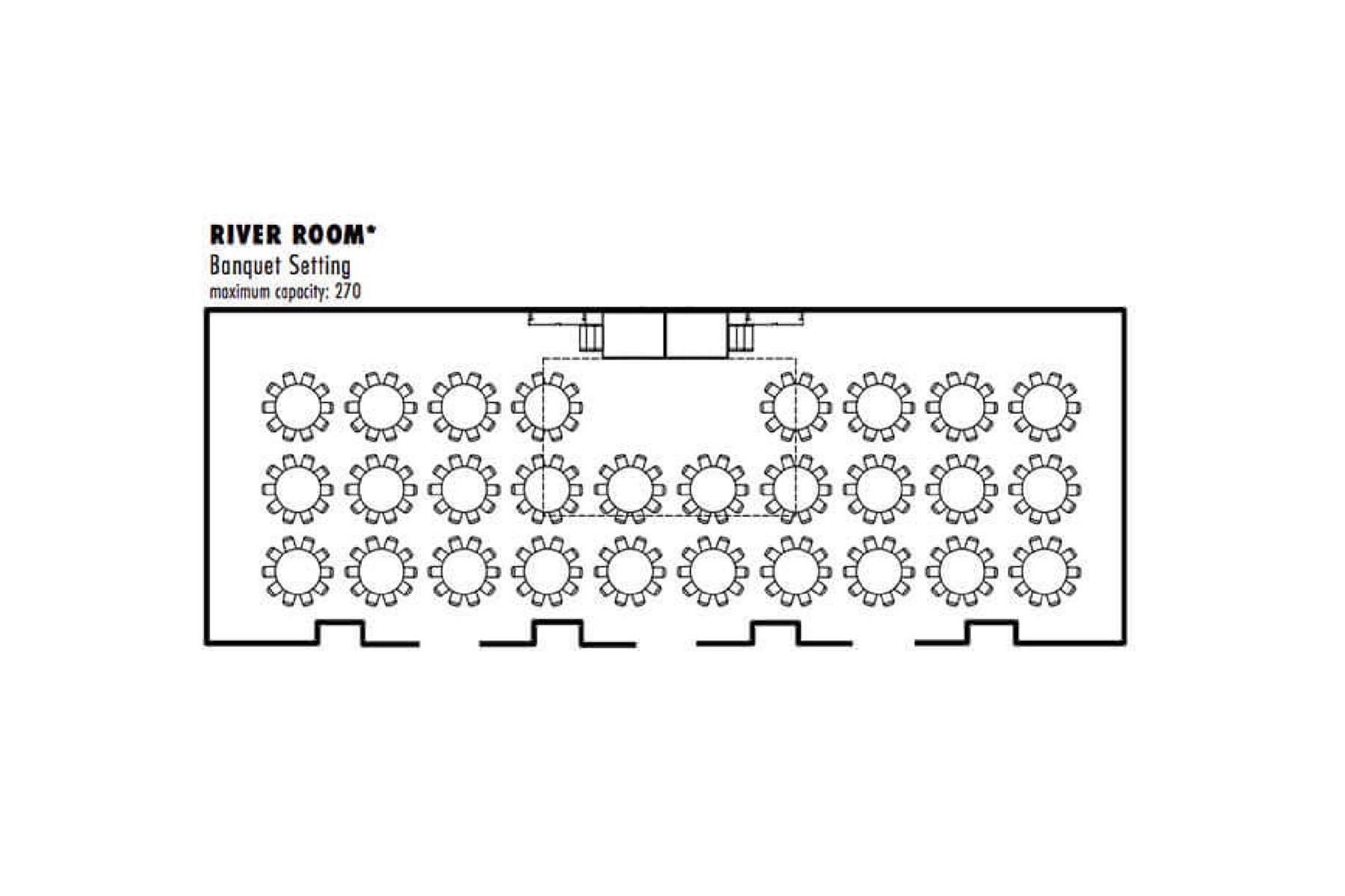 The River Room offers the ultimate in flexibility. It can be partitioned into three separate sections for a more intimate space, or used as a single space for a dinner or cocktails. Designed to hold up to 200 guests.