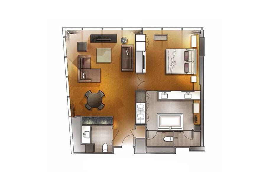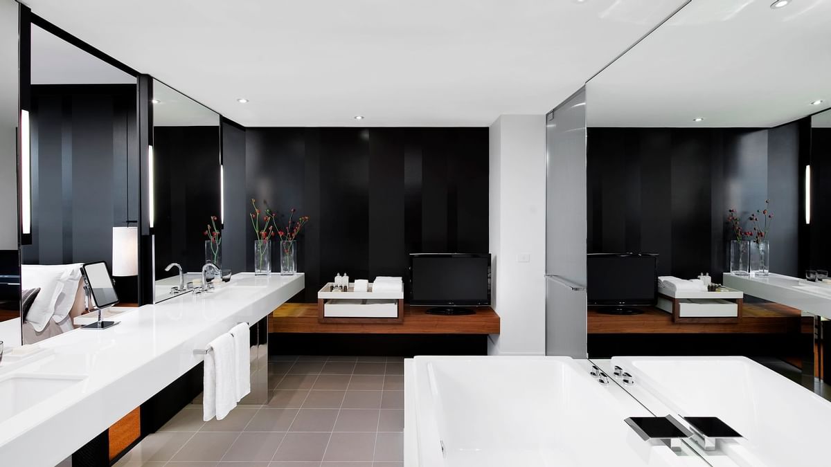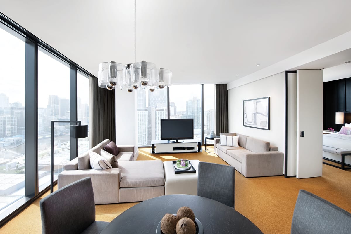 The Loft at Crown Metropol Melbourne has a lounge room, dining area, enclosed bedroom, custom made king bed, bath tub, walk-in rain shower, powder room, fast and free internet, individual climate control, and boutique bath amenities.