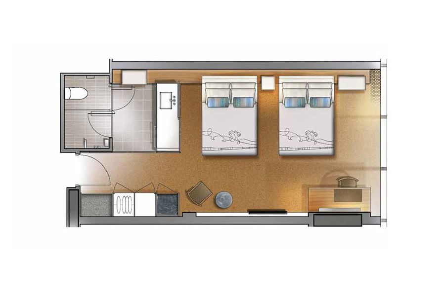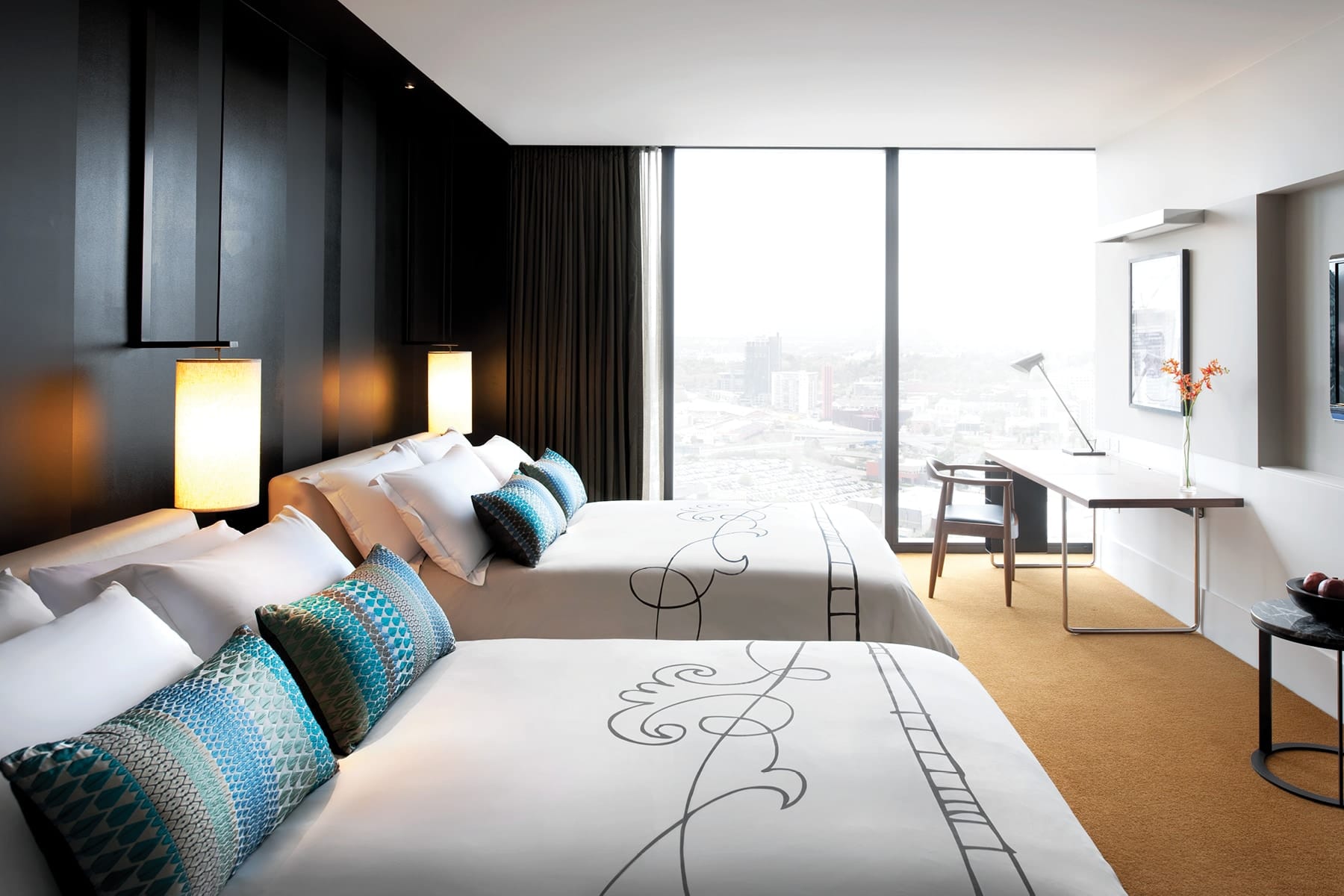 The Luxe Twin at Crown Metropol Melbourne has two comfy beds, desk, floor-to-ceiling windows, bathroom with a privacy screen, fast and free internet, individual climate control and boutique bath amenities.