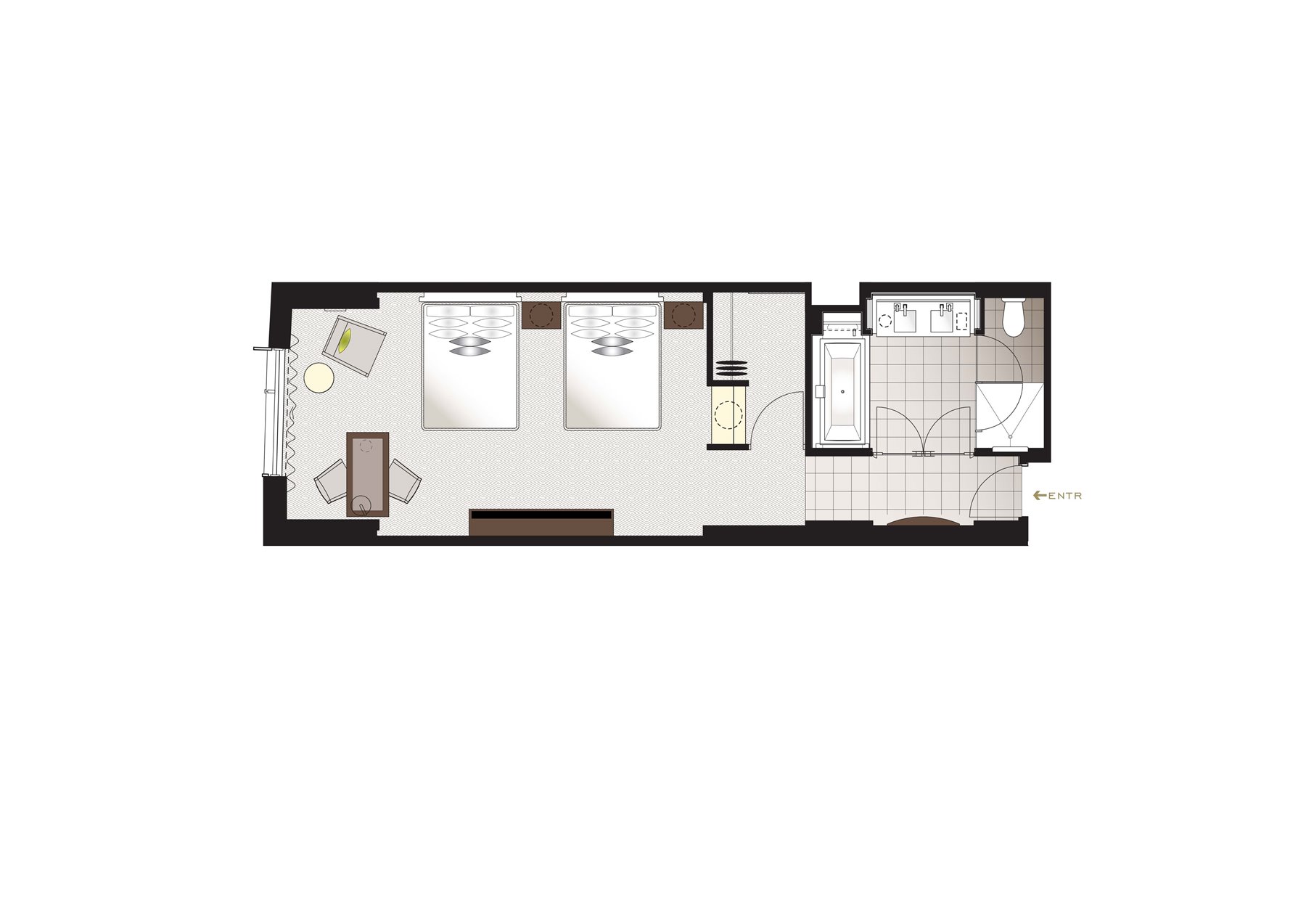 Located on level 5 to 18 with panoramic views of Melbourne's CBD, each Deluxe Twin Room features an oversized bathroom with double marble vanities, deep soaking bath with television, separate shower, walk-in dressing room and the latest in-room technology.