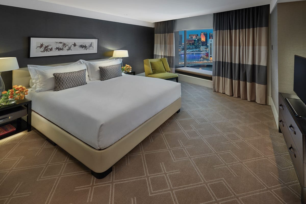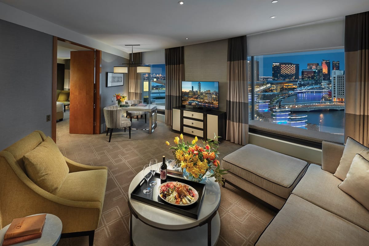Take in the breathtaking views of Melbourne or Port Phillip Bay through floor to ceiling windows from the separate lounge area or luxuriate in the deep soaking bath in the oversized bathroom. The Executive Suite at Crown Towers also has a walk-in dressing room and the latest in-room technology including 24 hour in-room dining and concierge services.