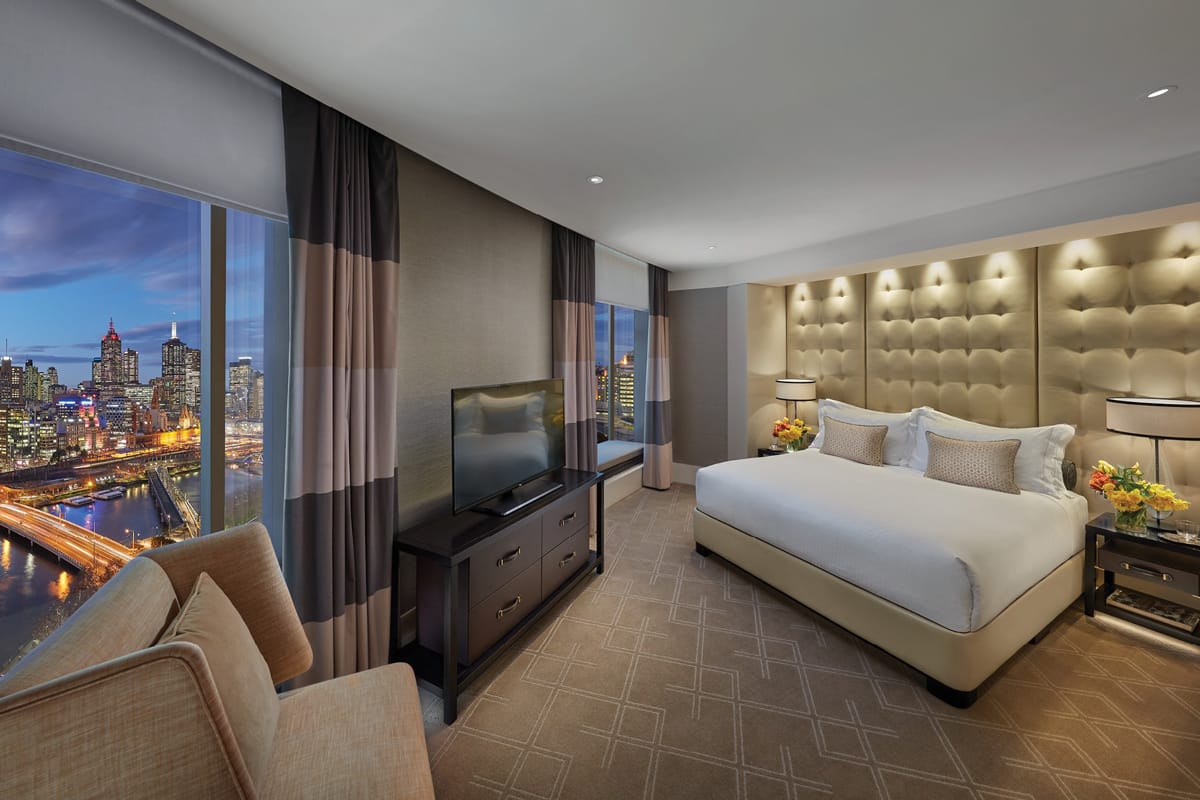 The one bedroom Premier Suites at Crown Towers offer 77 square metres of unparalleled luxury enhanced by floor to ceiling windows taking in 180 degree panoramic views of the city or Port Phillip Bay. Located on level 5 to 18, the Premier Suite boasts a separate lounge area with luxurious chaise lounges, a glass encased marble bathroom with deep soaking bath and walk-in dressing room.
